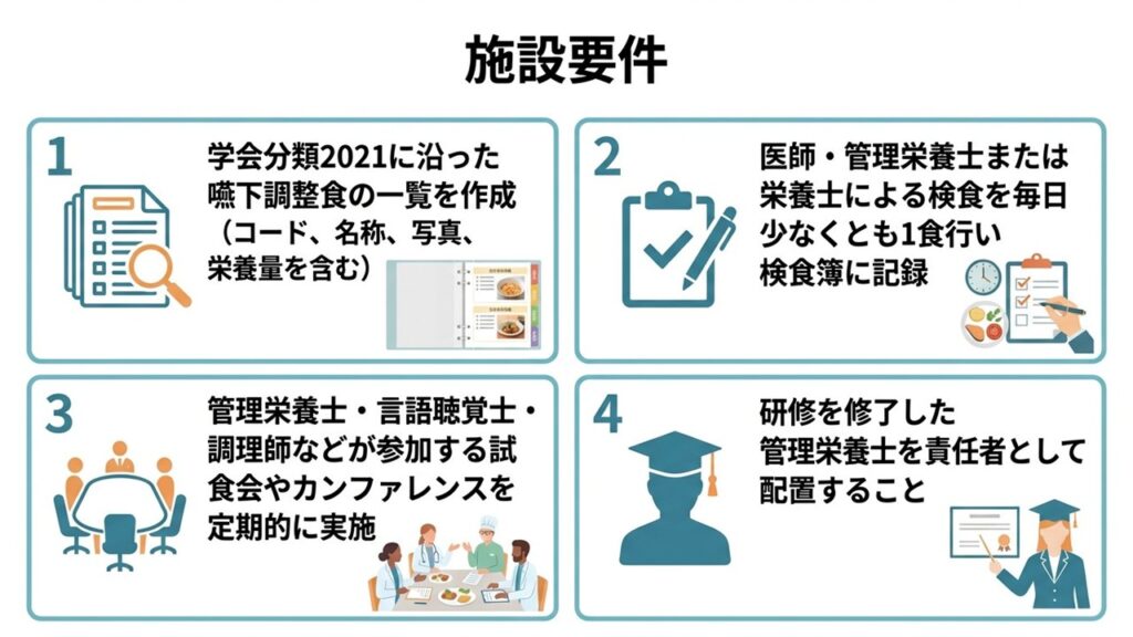 嚥下調整食に係る特別食加算を算定する医療機関は、以下の要件をすべて満たしている必要があります。